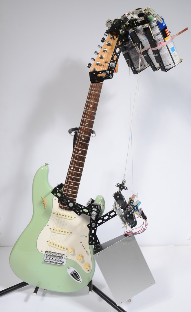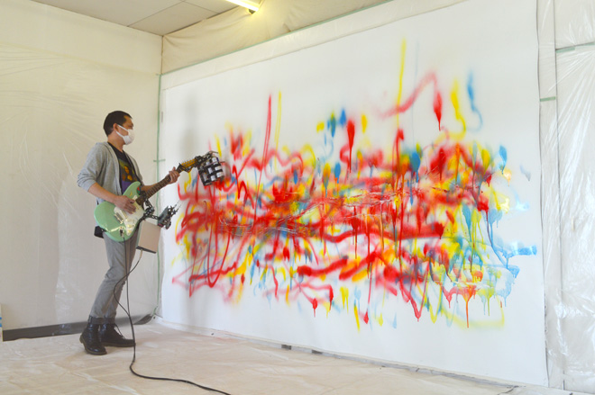 今回もとんでもない作品が目白押しで、機知に富むもの・キチに飛ぶもの・奇智に尽くされた名作・珍品・異形なアイテムが登場していたけれど、BARKS賞に輝いた宮崎政史氏「ギター絵画」は、頭ひとつ飛び抜けて異彩を放っていた。応募時のコメントには「ギターを弾いて、低音域だと赤色、中音域だと黄色、高音域だと青色のスプレーが出る装置を制作しました。このギターで絵を描きます」と書かれている。