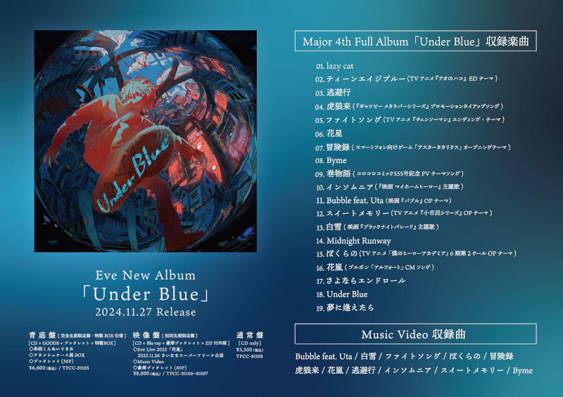 初回生産限定・映像盤には2023年11月に開催された<Eve Live 2023「花嵐」さいたまスーパーアリーナ公演>のフル尺映像&MVを収録したBlu-rayと、ライブ写真やMVのキャラクター資料などを掲載した豪華ブックレットが付属される。また、全形態の初回プレス分に<Eve 2025 Arena Tour「Under Blue」>最速先行受付に申し込めるシリアル・ナンバーが封入される。詳しくはアルバム特設サイトをチェックしてほしい。