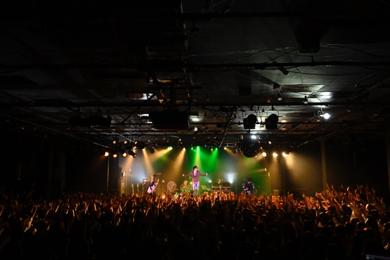 ブラシを使ったジャジーなドラムが印象的な「恋の泡」で地上に戻ったあとは、「朝帰り」で明るいムードを引き寄せる。とたんにマオの表情もきらめきだし、フロアには軽快なクラップ音が鳴り響く。そうして「Closet」では、間奏が始まるとマオはドラム台の前に立ち、キメを真似してはしゃいで見せる。そのノリを引き継ぐように、このあとのMCでは「俺は革ジャンだぞ! 涼しさを捨てて。お前ら何着てるのか素材を言ってみろ」と無茶ぶりすると、元気な声で「綿」、「レーヨン」とあちこちから声が上がる。このリアクションにはマオも「綿じゃねぇよ」とつっこみながら大笑い。