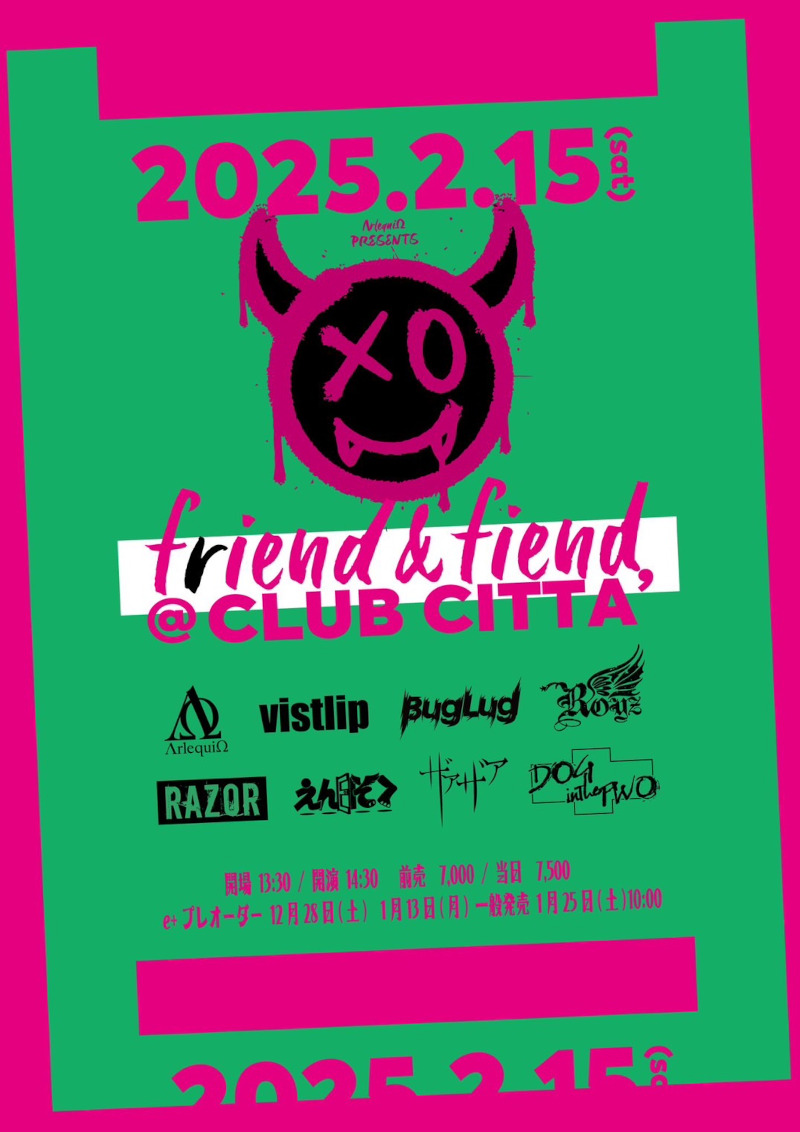 そして2025年2月15日には、川崎CLUB CITTA’にてΛrlequiΩ主催<friend & fiend 2025>の開催が決定した。ゲストには前回に続きRoyz、RAZOR、えんそくが出演するほか、新たにvistlip、BugLug、ザアザア、DOG inTheパラレルワールドオーケストラが参戦する。