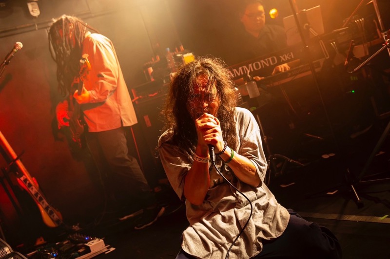 それはさておき、G-FREAK FACTORYのライブはいつも通り原田、吉橋“yossy”伸之(B)、岩本“leo”怜王(Dr)、サポートの多畠幸良(Key)によるジャムセッションからスタート。4人の演奏が徐々に熱を上げていったところに茂木が加わり、「G-FREAK FACTORY始めます!」と声を上げ、原田がリフをかき鳴らすと、観客がステージに押し寄せ、すし詰めのフロアが揺れ始める。しょっぱなから、“Yeah Oh! Yeah Oh!”と観客がバンドの演奏に応え、シンガロングの声を上げたと言ったら、ファンなら何の曲かわかると思うが、そこから1時間20分。「残念ながらこの暗い時代に明るいものを見つけにいこう」と茂木が言つつG-FREAK FACTORYが演奏したのは、現在の彼らのライブに欠かせない代表曲に加え、新境地もアピールしつつ、彼ららしさに磨きを掛けた『HAZE』からの新曲の数々だ。