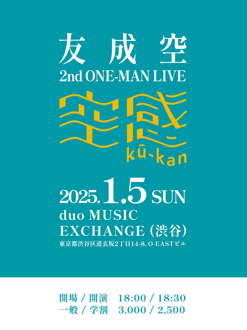 友成空が、2025年1月5日に東京・duo MUSIC EXCHANGEにて2ndワンマンライブ<空感 kū-kan>を開催することを発表した。チケット最速先行抽選受付は、明日11月3日18時から開始される。