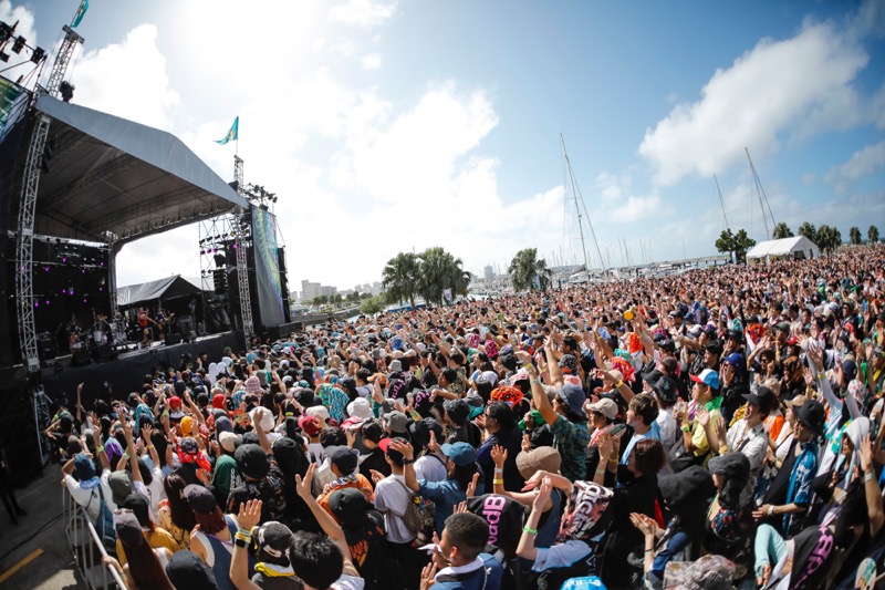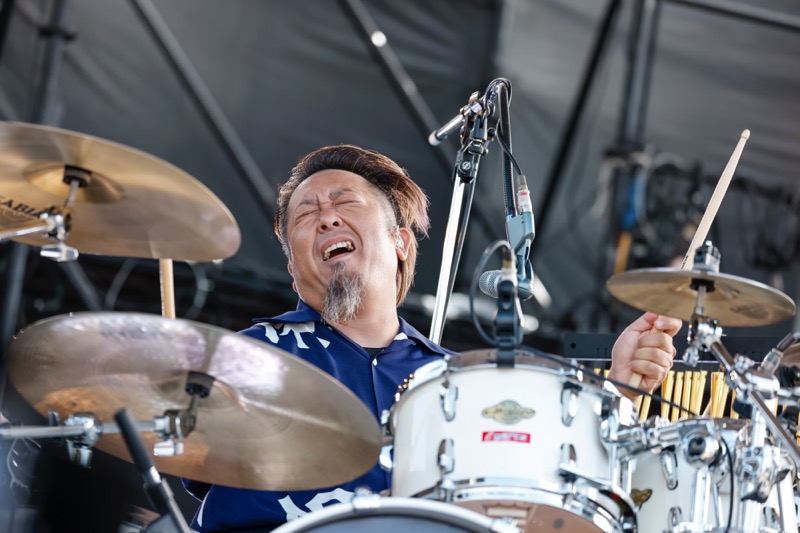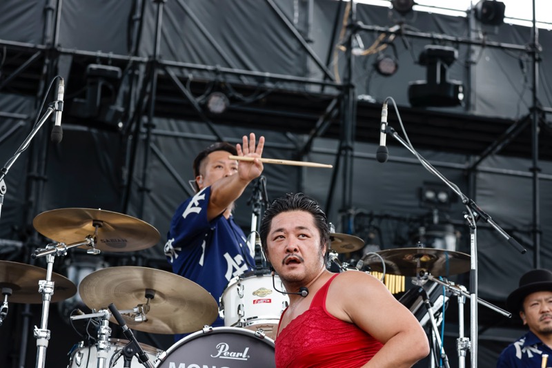 その熱量を保ったまま、レゲエのグルーヴが沖縄のビーチによく似合う「OKINAWA CALLING」、そして、意表を突くモンパチ流アレンジで童謡「シャボン玉」のカバーが演奏されると、粒さんは巨大な赤いバルーンを客席に投げ入れる。しかし、やや強めの風のせいでバルーンは思うように客席内を移動せず、粒さんはキヨサクに「風を読みなさい!」と笑顔で怒られ、大きな笑いを誘った。そんなシーンもまた、このフェスの幸福感をひと回りもふた回りも大きくしてくれるのは、他でもない、沖縄のヒーロー、モンパチの、正真正銘の沖縄のステージだからだ。