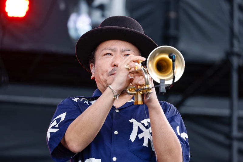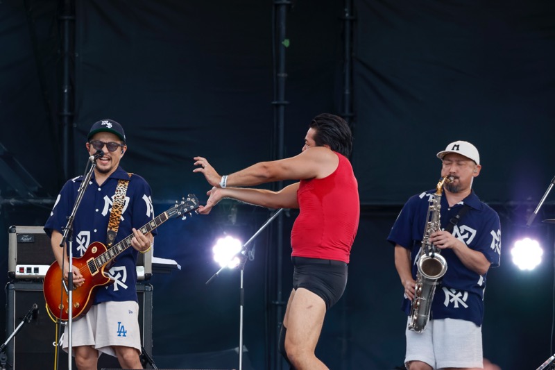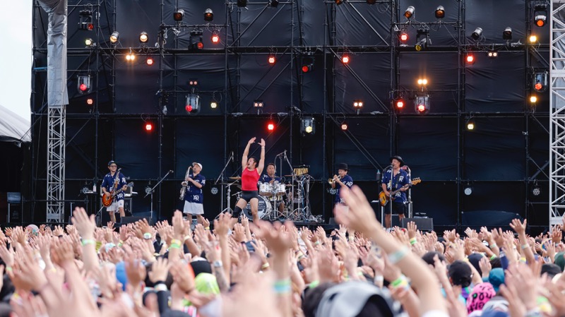 ……と思いきや、舞台袖へと姿を消したメンバーと入れ替わりにステージに現れたのは、ダンサー粒さん。ハイパーな90sダンスチューンをバックに彼のソロダンスが披露されると、そこにバンドメンバー5人が加わり、パラパラを披露。そのままスカビートでリアレンジされた安室奈美恵 with SUPER MONKEY’S「TRY ME ~私を信じて~」のカバーへ突入すると、一旦、移動し始めた観客が再びマングースステージへ慌てて戻り始め、太陽の陽射しがまぶしい沖縄のビーチは、幸せな南国のダンスフロアへと変貌していった。