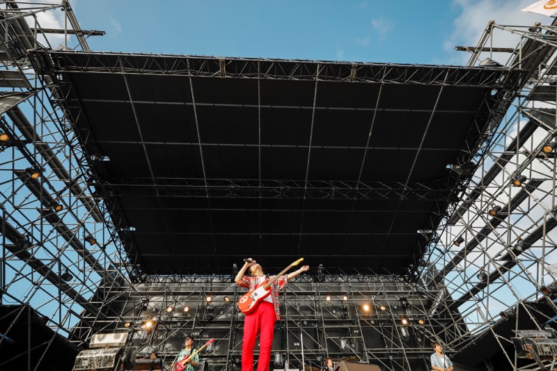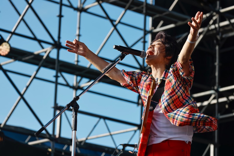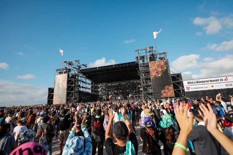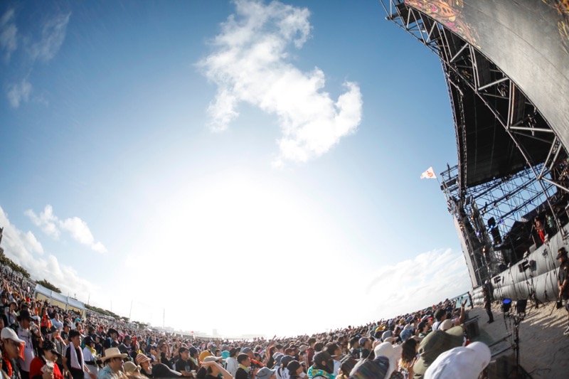そしてラストは、スタレビの名曲をメドレー形式にした12分を超えるディスコナンバー「ブギウギワンダー☆レビューのテーマ」を披露。ディスコのリズムで多彩なメロディが紡がれたこの曲で、否応なしに楽しく、音楽の醍醐味を味あわせてくれた彼ら。すべての曲を演奏し終えると、メンバーはステージフロントに並んで観客に手を振り、フロントマンの根本はハブステージに集まった大勢の人々に投げキッスをした。すると観客からは指笛が吹き鳴らされ、沖縄らしい暖かい空気感に包まれながら、スタレビのライブは幕を閉じた。