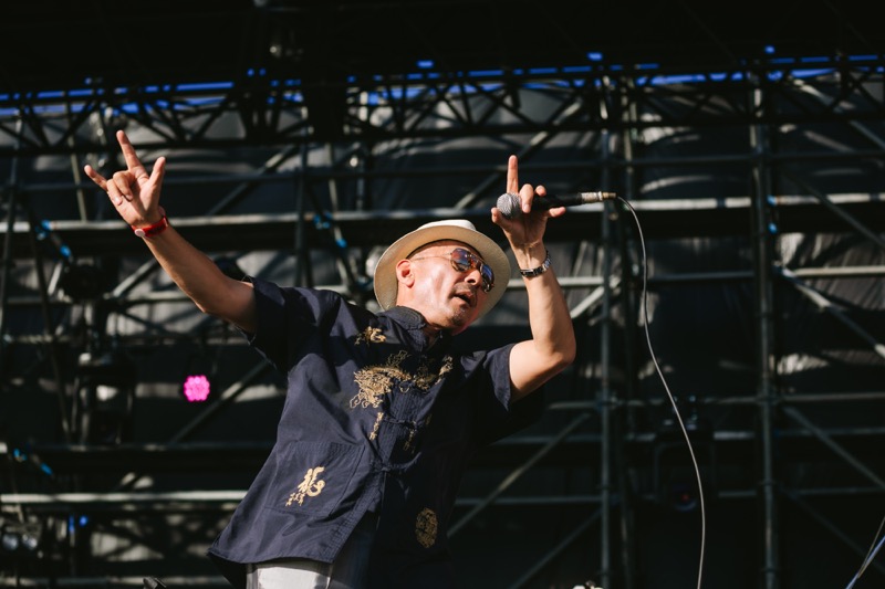 「横浜から来ましたけど、せっかく来ましたのでね」と、「うち」「なー」に始まり、「フィンガー」「5」とか、「仲宗根」「美樹」とか、「登川」「誠仁」とか、「コンディション」「グリーン」とか、「古謝」「美佐子」とか、沖縄にゆかりのあるミュージシャンやバンドの名前を使ってコール&レスポンスを繰り広げ、横浜レペゼンソングの「ハマのビート」に突入。パーカッションのスモーキー・テツニによるクールなダンスも飛び出して、ハブステージのボルテージはぐんぐん上がっていく。