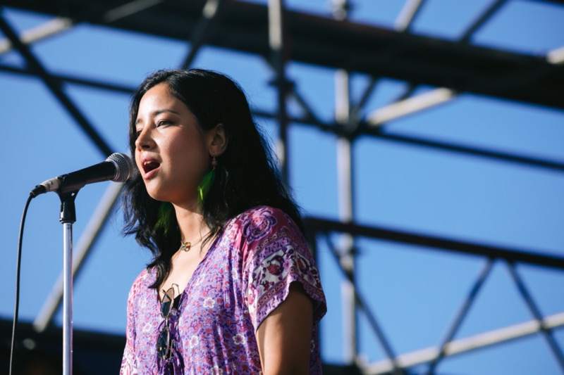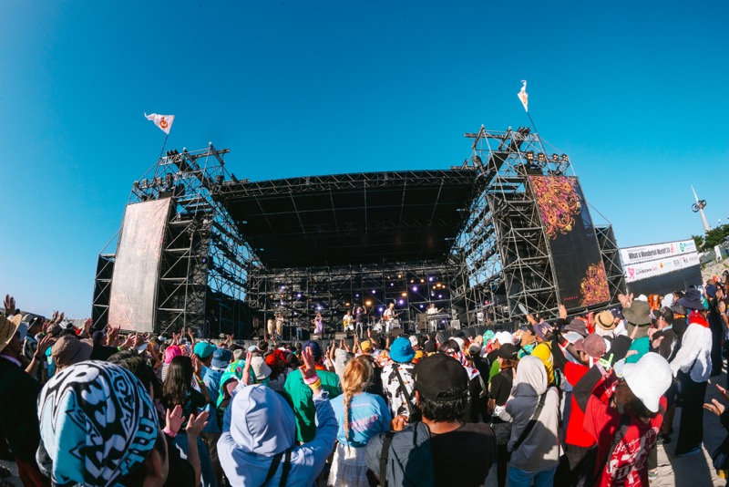 そして「イーヤーサーサ」と掛け声をかけつつメロウなリズムとメロディでゆったりとオーディエンスを揺らす「観光」へ。コーラスを務めるAyeshaの声と横山の声が絡み合い、少しずつ陽が傾いてきたビーチに一足早く夕暮れのムードを連れてくる。