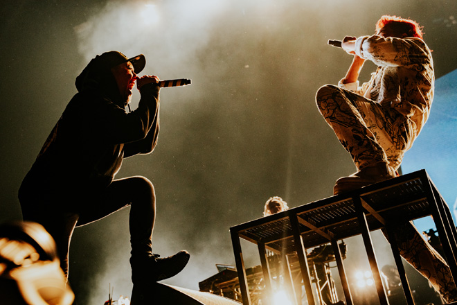アルバム『AЯK』冒頭と同じく、「The Final Call」~「ZERO」と、早速の轟音を観客に浴びせかけ「どうすか、調子は。SiM、20周年おめでとう。バチクソ暴れて帰ってください」と、ドアタマからオーディエンスを煽りまくり、「God Speed」「L.A.M.N」など推進力抜群の楽曲を続々投下していく。