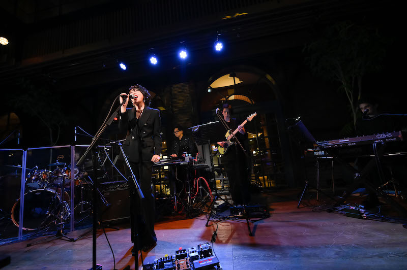 定刻になり、吹き抜け2階建ての上質な空間と自身のプロジェクト名にふさわしいブラックのスーツ+ピンヒールで身を固めたLittle Black Dressの遼(Vo, G)が登場。バンドメンバーは、岡聡志(G)、サム・ポマンティ(Key)、Devin Kinoshita(Syn-B)、FUYU(Dr)という布陣だ。