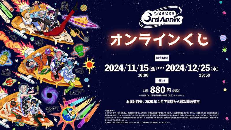 また、「祝3周年・カリスマオンラインくじ」が11月15日10時~12月25日の期間に販売されることが明らかとなった。3周年記念イラストを使用した賞品やアイマスクなどバラエティに富んだ賞品ラインナップとなっている。