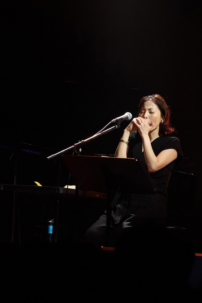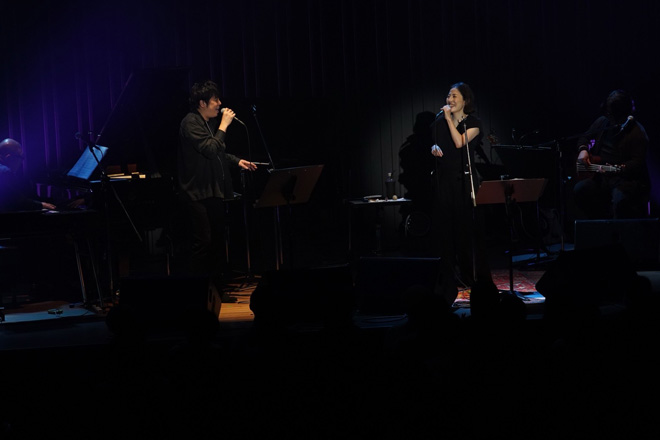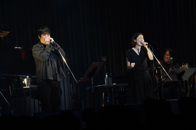 「いろんなプロデューサー、ミュージシャンと作品を作ってきましたね。ライブ感を出してレコーディングするのをずっと大切にしています」と、話題は再び制作にまつわるものとなり、今回のリリースについて「7、8年ぶりでね。早く歌を聴いてほしいと、最初は家で録ろうかって言ってたくらい」と松岡が話すと、「宅録もいつかやりたい」と矢野が返し、ふたりが本当に家にいるかのような夫婦の会話も展開された。「面白いことができたらいいなと。多くの人に届いてほしいなと願ってます」と松岡が結んでから、「太陽」が届けられた。木漏れ日のようなオレンジ色のライトに包まれて吹き鳴らす矢野のブルースハープが冴え渡り、ピアノの新しい風がこれまでのアコースティック・アレンジを一新していた。