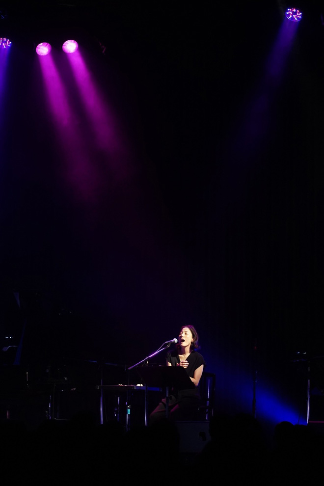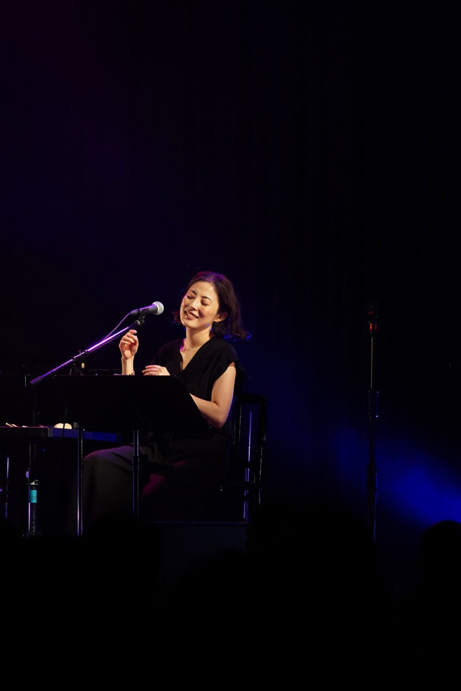 「じゃあ、歌うね」と言い、椅子に腰かけると、静かに「のろいのように」が始まった。タイトルにある“呪い”という言葉から連想するダークさとは裏腹に、ポップなメロディーが印象的だ。孤独な女心を描いた詞を歌い終えると、再び静寂が訪れる。暗闇にミラーボールから放たれる月明かりのような光の下で奏されたのは「青空に浮かぶは白い月」だ。3分ほどの短い曲だが、絵本のページをめくるように情景を想起させる矢野の豊かな歌唱力が際立つ。続いた「大人と子供」も同様に、その確固たる世界観が歌声で瞬く間に創り上げられる様は実に鮮やかだった。