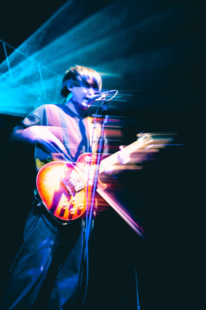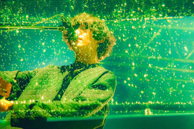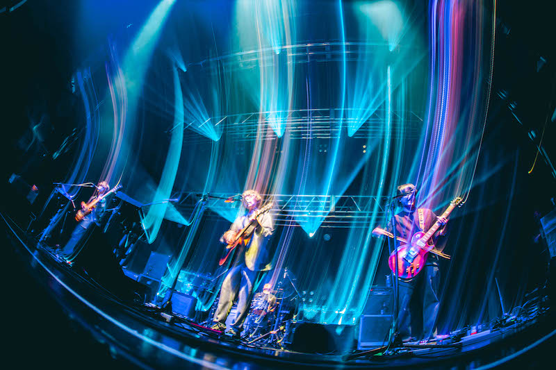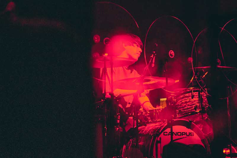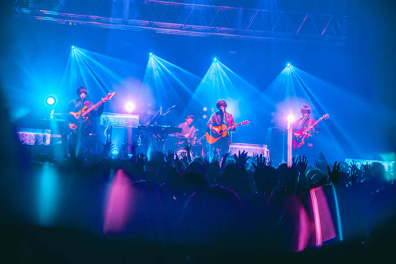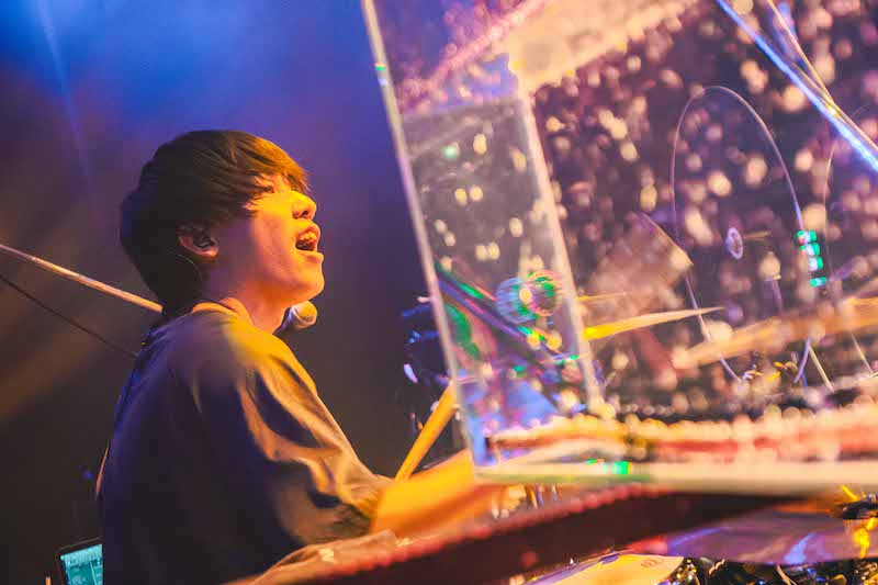 客電が落とされ、ステージ後方の照明がおもむろに灯り始める。舞台上には、ギターアンプやシンセサイザー、ドラムセットといった機材の狭間に、気泡が絶え間なく浮かび続ける4つの水槽が配置されていた。メンバー三人より少し遅れて登場した武市和希(Vo, G, Key)が、ピアノのコードを奏で始める。ライブの口火を切ったのは、最新作『Φ』のラストチューン「R」。物語のエンディングを思わせる内容であり、実際にツアー初日では本編の最後に演奏されていた楽曲だ。本公演が、『Φ』を再解釈し新たな色や形を作品に与えるものとなることを予感させる選曲とも言えるだろう。続く「Answers」の軽快な16ビートが、少しずつ、しかし確かに、私たちを幻想的な世界へと連れ去っていく。