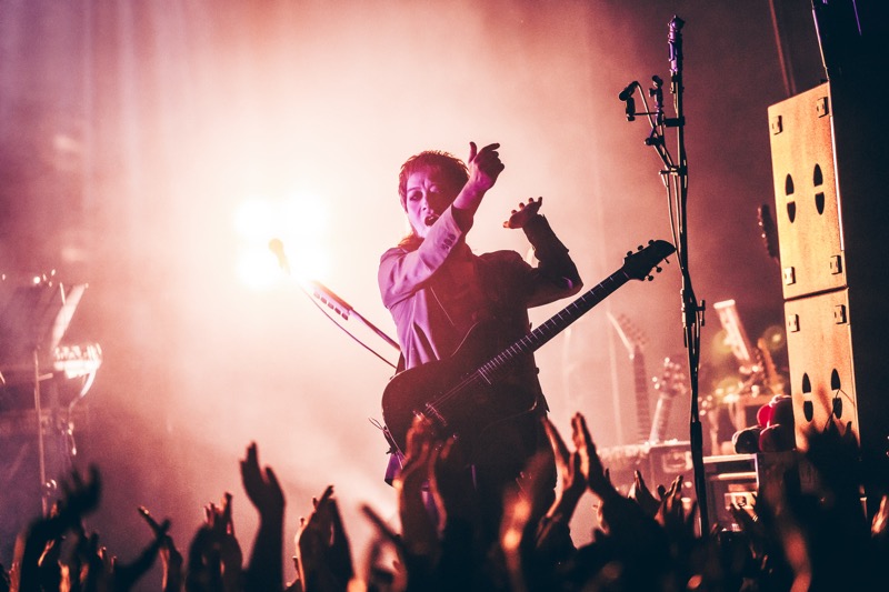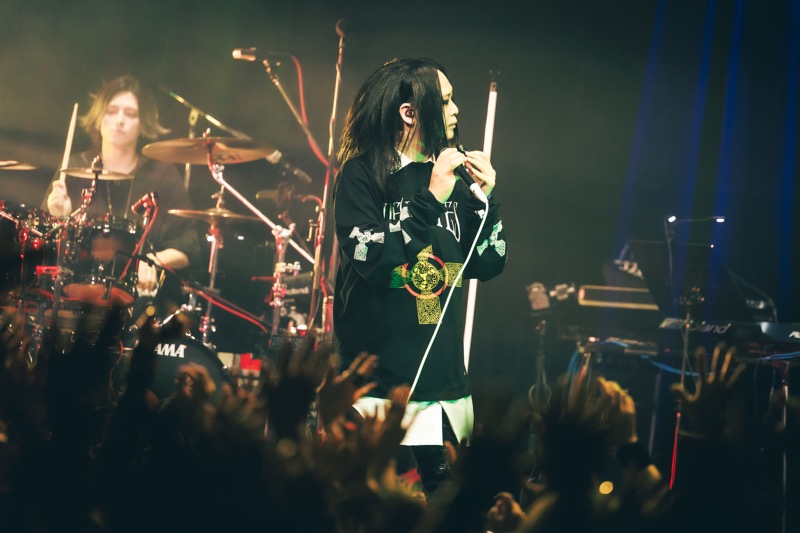 この記念すべき一夜の冒頭を飾ったのは、YUKKEが作曲し、逹瑯とYUKKEが作詞をした「CLASSIC」。なお、この曲が始まった時にYUKKEはいかにも主役らしくステージセンターに陣取っており、その頭上ではキャノン砲が炸裂。彼にだけ、そのキラキラしたテープが降り注ぐことになった。こんなにも局地的な銀テープを観たのは初めてだったが、おそらくそれは演出チームからのYUKKEに対する小粋なバースデープレゼントだったに違いない。