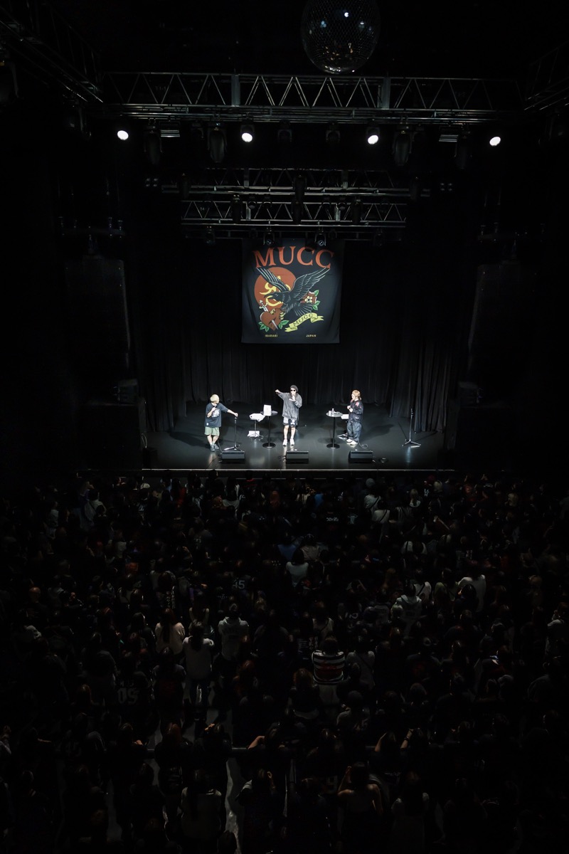 しかも、このあと19時からはZepp Shinjukuの同じステージで<MUCC TALK TOUR 2024「MC」>が始まり、ここでは小さなハイテーブルがふたつだけ置かれた広い空間の中、逹瑯、ミヤ、YUKKEの3人がハンドマイクを持って1時半以上ものトークを展開することになったわけで、メンバーも集う夢烏の方々も、約24時間で3回しとは尋常ならざるスタミナなのでは?!