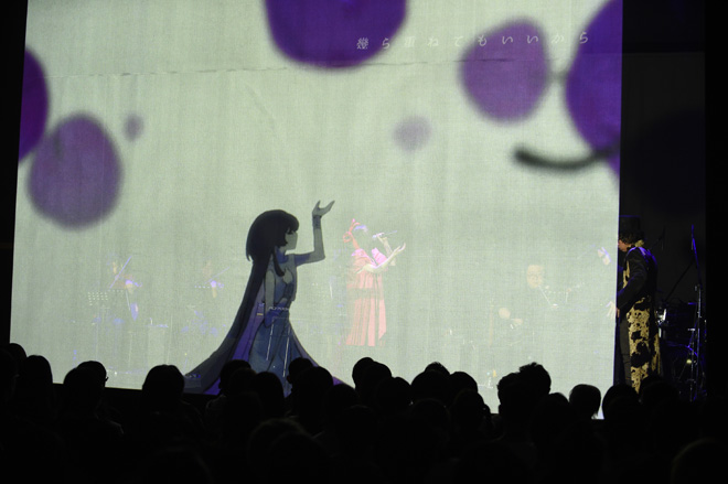 楽団員による「フタハ(inst ver.)」が始まると、観客から手拍子が巻き起こり、会場の一体感はさらに増していく。そして再び透過スクリーンに登場したHACHIは、新曲の「檻」を初披露。軽やかなビート感に包まれた。