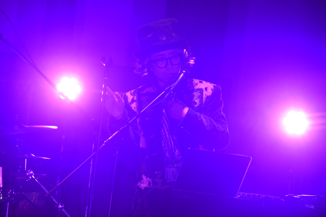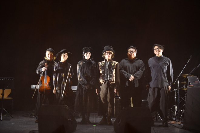 謎の言語で始まったオープニング映像であっという間に未来古代楽団の世界へ引き込まれていく中、楽団のメンバーの砂守岳央、松岡美弥子、吉田和人、吉田篤貴、河村泉、田中教順がステージに登場。