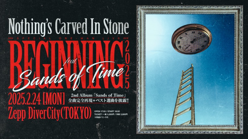 Nothing’s Carved In Stoneが2025年2月24日、Zepp DiverCity(TOKYO)にて、2ndアルバム『Sands of Time』の完全再現ライブ<SPECIAL ONE-MAN LIVE “BEGINNING 2025” feat.『Sands of Time』>を開催することが発表となった。