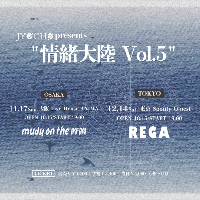 <情緒大陸>は、2019年にスタートしたJYOCHO主催の対バン企画で、先鋭的な音楽を奏でるアーティストが数多く出演しており、現在開催中のVol.5では大阪編にmudy on the 昨晩、東京編にRegaが名を連ねている。