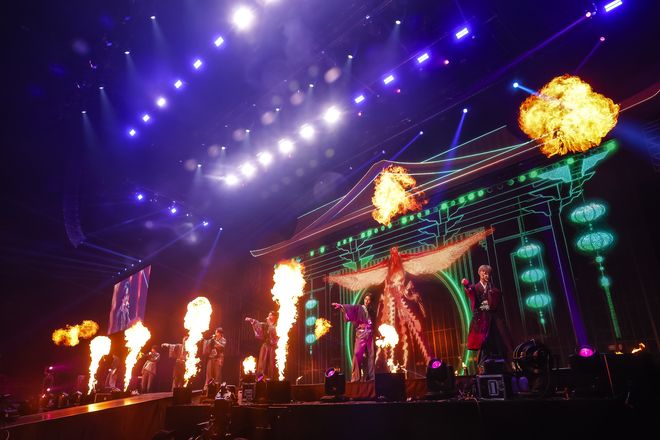 LEDが全面赤に染まり、哲学的な歌詞を載せたピアノロックという彼らの最も代表的な個性を表す「柘榴」では、ダークな映像も交えつつ笑顔を封印。「無限シニシズム」でも社会と自嘲を吐き出すようなボーカルと、シリアスな心象風景を表すようなダンスで、タイトルが表す混沌を表現していく。曲を締めくくった大倉と吉澤のエモーショナルなラップは、続く「Museum:0」でも炸裂。繊細なピアノの音色も仕込んだヘヴィロック曲で時にゾッとするほどエキセントリックな冷笑も浮かべながら、歪んだボーカルと激情にまみれたパフォーマンスで客席に迫り、“何処にもないなら 描いてしまえばいい”と叩きつけて圧倒する。そしてステージ上のトーチに火がともり、ファイヤーボールが噴き上がると、このライブのために和風アレンジされたエレクトロダンス曲「0to1