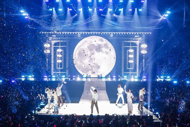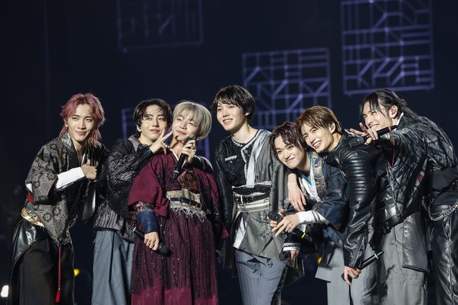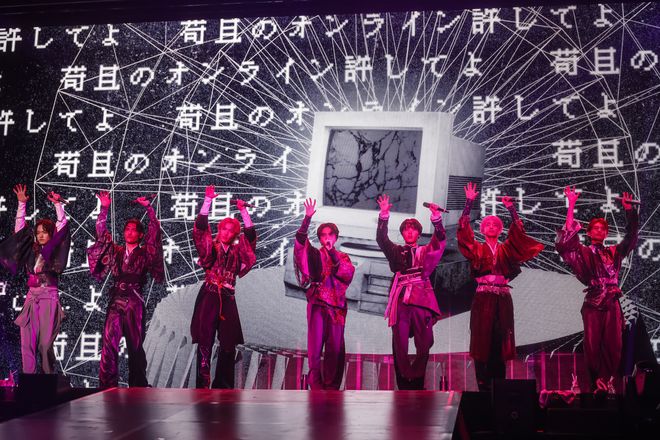 の幻想」でフィナーレへ。一聴では同じ曲とわからないほどサイバーに変貌を遂げたトラックに乗り、7人はオリジナル以上にアグレッシブに弾け、ダンスパートでは多彩色の炎も噴出。背後のLEDでは“零”と“壱”の文字が回り鳳凰が舞って、壮大な電脳空間を創り上げる。パフォーマンスを終えると和楽器の音が鳴るトラックでスライドダウンし、ファイヤーボールの向こうに一瞬で消える彼らは夢幻のごとく。まさに『白昼夢』だったのではないか?と思う間もなく映像が流れ、2025年の彼らにまつわる3つの特報が知らされた。