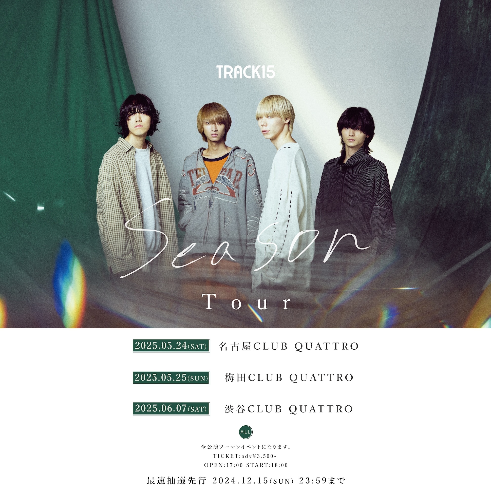 <TRACK15 「season」 Tour>は来年5月24日の梅田 CLUB QUATTRO、25日の名古屋 CLUB QUATTRO、6月7日の渋谷 CLUB CUATTROの3会場が舞台となり、各公演1組のゲストを迎えたツーマンライブとして行われる。各日のゲストアクトは後日アナウンスされる。イープラスでは本日より12月15日23時59分までチケットの最速抽選先行予約を受け付けている。