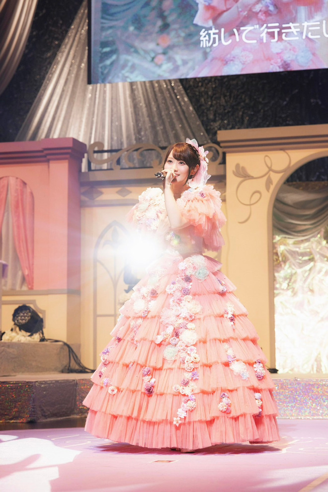 映像が終わると、少し大人びたエメラルドグリーンのドレスとリボンを組み合わせた衣装にチェンジした小倉が、清 竜人氏が手掛けた新曲「花占いするの♡」を熱唱。今回のアルバムでも「一瞬だから美しい、せつさなさ」を表現したかったという小倉は、「シュガーハートエイク」「恋の秒針」と“切なさ”を感じさせる楽曲と「秘密♡Melody」を続けて披露し、MCを挟んで、新曲の「スターチス」を歌い上げる。