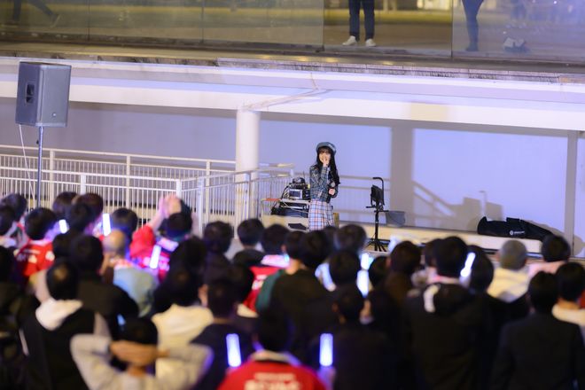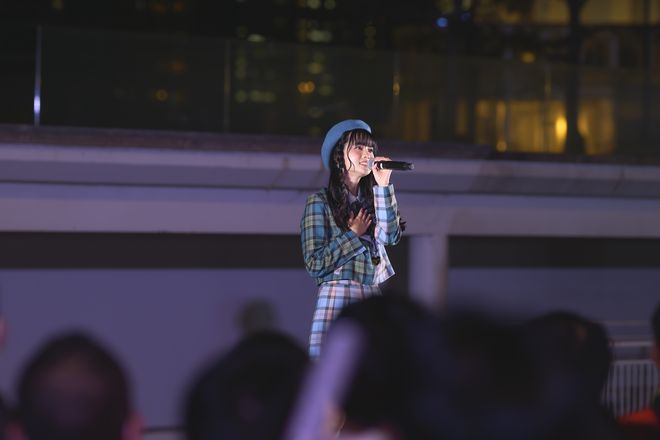 しっとりとサビを歌うところから始まり、イントロからどんどん盛り上がっていく楽曲。特にサビの開放感は素晴らしく、夜空に歌が広がっていく感じが、とても心地良かった。ファンも全力の50%、もしかしたらそれよりも抑えながらコールを送り、盛り上げる。そして曲の最後、ひとつの聴きどころとして〈まだ見ない、未来に行こう〉というセリフパートがあるのだが、ここは〈まだ見ない、〉だけ歌い、〈未来に行こう〉を観客に歌わせるというアレンジに。これにはファンも慌てて対応し、セリフを叫んでいた。