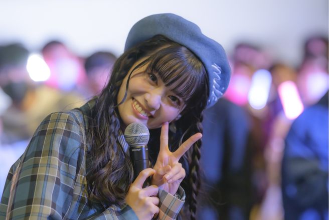 ミニライブは、さらにもう1曲を用意。「みなさん歌えるところは一緒に歌っていきましょう!」と言って、カップリング曲の「Fall in you」を披露。とにかくキュートな王道アイドルソングで、コールやクラップなどで、ファンも一緒に楽しめる楽曲。8月のファンミーティングで一度歌っているのだが、今回は楽曲がリリースされた後ということもあって、ファンも、どこをどう盛り上がっていくかをしっかりと掴んでいるのが伝わってきた。今後、本気でコールを送るライブもあるはずなので、そのとき、さらに楽曲の勢いは増すはずだ。いずれにせよ、ライブで絶対に盛り上がる強力なナンバーが、彼女の持ち曲に加わったことは間違いない。