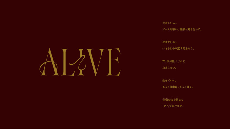 25周年のコンセプトは、AI自身の名前を内包し 「生きている」という意味を持つ言葉「ALIVE」だ。AIのパーソナリティや楽曲との親和性を表す最適なワードであり、周年を過去の振り返りにせず、今を生き、未来へのエネルギーにするニュアンスを込めたコンセプトになっている。
