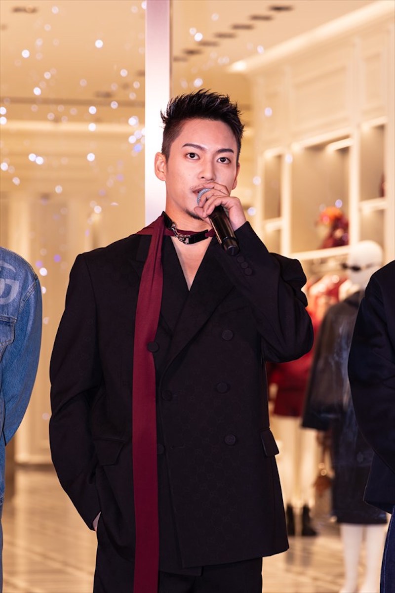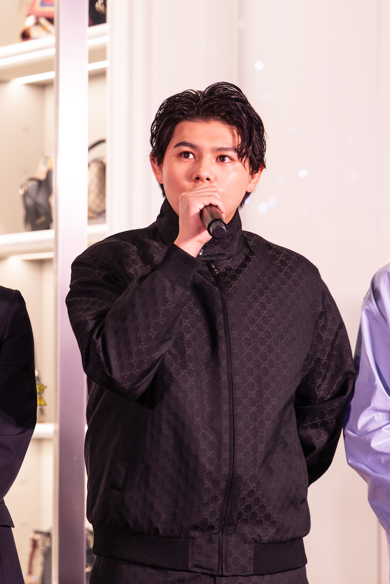 オープニングイベントがはじまるとグッチの新作コレクションを纏ったBE:FIRSTが登場。グッチの新作クルーズコレクションについてコーディネートのお気に入りのポイントを聞かれたSOTAは「デザイナーが変わってから2年ぐらい経つんですけど、本当変わった時からずっと注目させていただいて、いちファンなんです。クラシックなGUCCIの良さをエレガントに残しつつ、シルエットとか最近のどんどん新しいものに追及されていていって。僕的には、このジャケットの形やラインの残し方がすごいお気に入りです」とコメント。