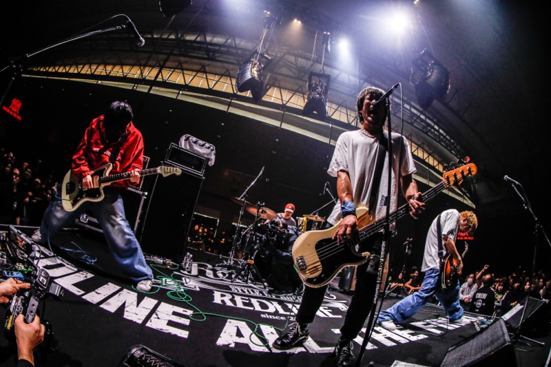 このステージには、「bacho、KOTORI、ハルカミライと共に開催した<REDLINE FOUR FISTS>の代表として立っている」と宣言し、オガワのキックの踏み込み方が沁みる「手紙」で会場全体をグッと包み込んだ後、フロアからの天井を突き破るような大合唱にも圧倒させられたのが「素晴らしき世界」だ。ステージへ向けられる無数の拳と眼差し。ダイバーも続出し、誰もが遠慮なしの空間。だが、それがいい。やりすぎぐらいでもまだまだ足りないほどの想いがここにはあるのだ。