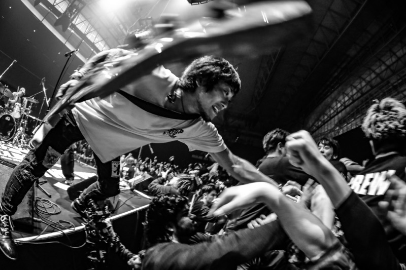 もちろん、その勢いは止まらない。“君を一人にしないさ”という歌詞も実に沁みた「明日はいらねぇ」を放ち、続けざまに「WORLD END」を食らわせる。いつものように「手を繋ぎに来いよ!」と呼びかければ、前へ前へと叫びながら押し寄せる観客。その想いに応えるようにクニタケもフロアへ身を乗り出て気持ちを交わらせる。