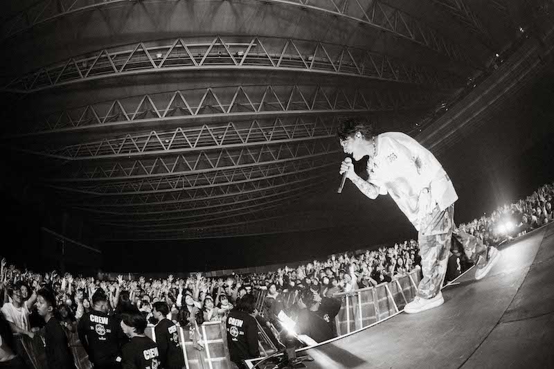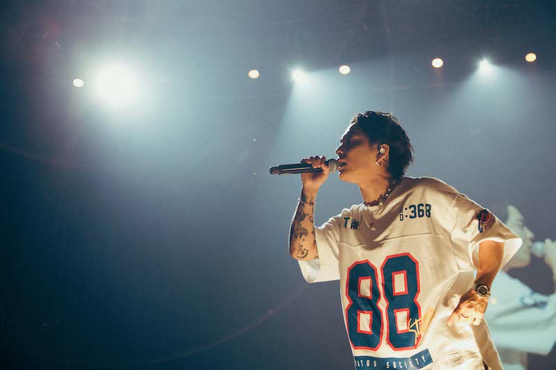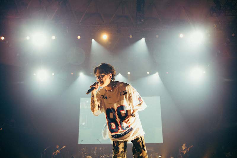 そんなふうに数ある見どころの中で一番盛り上がったのが「ドライフラワー」。誰もが知っている(という表現は決して大袈裟ではないだろう)このバラードを、この日、優里は「Punk rock ver.」で披露した。たぶん、彼のことをこの曲の印象からバラードシンガーだと思っていた人はきっと面食らったはず。しかし、「もっと声をくれないか!?」という優里に応え、シンガロングの声を上げながら、熱狂なんて言葉も思い浮かぶくらい盛り上がっている観客の様子を見るかぎり、ここには彼のことをバラードシンガーだなんて思っている観客はほとんどいなかったようだ。この「Punk rock ver.」、ライブではしばしば披露しているから、もしかしたらみんな期待していたのかもしれない。