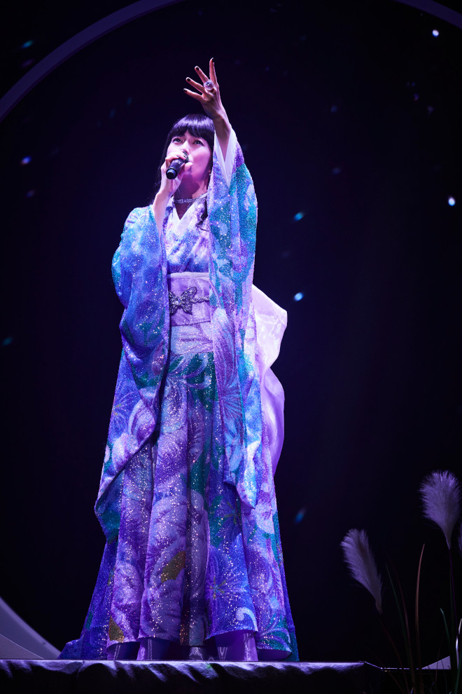また、ステージ上には、楽曲や照明によって月にも太陽にも、時には茅の輪や花輪、鏡にも見える、大きな円のオブジェが置かれていた。それぞれによって見え方は違うと思うが、本ツアーのコンセプトである“循環”を象徴するサークルの両端には、ススキと紫陽花が咲いており、それだけでも秋から梅雨へという季節の巡りを感じるのだが、紫陽花単体だけをみても、物語が進むにつれて、花の色が移り変わっていく様や萎れた後で元気を取り戻して再生する姿が描かれ、最後には枯れてもなお、美しい成熟さを表しているようだった。