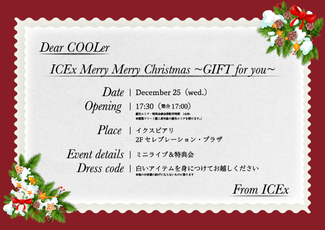 そして、リリース当日には舞浜イクスピアリ セレブレーションプラザにて、<ICEx Merry Merry Christmas ~GIFT for you~>と題した、クリスマスイベントの開催が決定した。