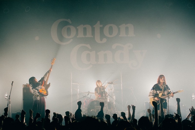 アンコールで再びステージに登場した3人は、紬衣が「情けない僕の歌」と紹介した「my JAM」と、アルバム『melt pop』の1曲目を飾る「相槌」を演奏。最後は「誰よりもデカい声で歌ってくれ!」と巻き込んで、「好きなものは手のひらの中」。1回やり切ったあとに「もう一回やっていいですか!」と叫び、紬衣のスタンドマイクをお客さんに向けてフロアに歌わせる。そして最後、紬衣は客席にダイブ。彩楓の途中の言葉も象徴的だったが、すべてを出し切る勢いでオーディエンスにぶつかりにいって、バンドの音でコミュニケーションを取ろうとするConton Candyはとても勇ましかった。アンコールのMCで紬衣が言った言葉は、「このツアーを悔いなく終わらせるためにここ立ってるんじゃない、次につなげるために立ってます」。今日の汗と笑顔は、Zepp Shinjukuワンマンへとつながっていく。