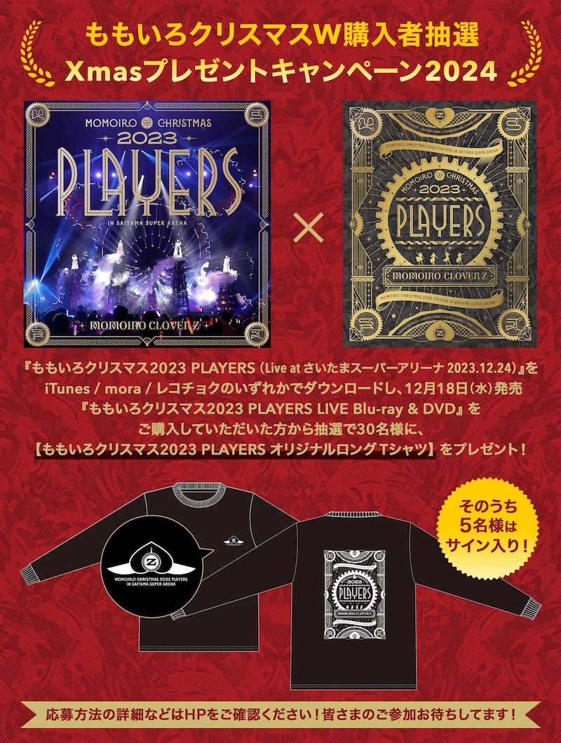 『ももいろクリスマス2023 PLAYERS (Live at さいたまスーパーアリーナ 2023.12.24)』をiTunes / mora / レコチョクのいずれかでダウンロードし、さらに12月18日(水)に発売となる『ももいろクリスマス2023 PLAYERS』LIVE Blu-ray & DVDの購入者を対象に、「ももいろクリスマス2023 PLAYERS オリジナルロングTシャツ」が抽選で30名様に当たるキャンペーン。