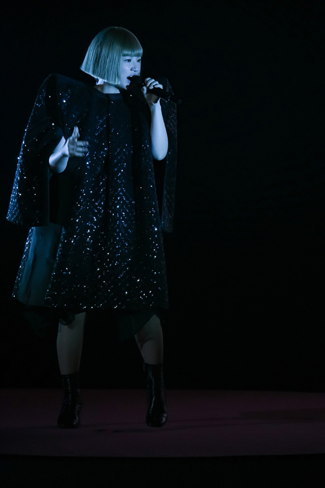 歪さや違和感が強烈なインパクトをもたらす幕間の映像を挟み、回転ステージ上部に3名のホーン隊、下部にYUKIが位置づくと、LEDビジョンに映るデジタルダンサーを従えて「流星slits」へ。ベビーピンクのアシンメトリーなドレスに着替え、体全体を使って会場全体を盛り上げていく。こちらも久々の披露となる「Jodi Wideman」は、巨大なミラーボールをバックに“SUPER SLITS Remix”と名付けたくなるような深遠なトラックに乗せてパフォーマンス。YUKIと観客のテンションは高まる一方だ。そこからシームレスにつながった「One, One, One」では、回転ステージ上部に電話ボックスと電灯が登場。曲の途中にYUKIが電話BOXの中へ入ると室内にはカメラが設置されており、YUKIの間近な表情をキャッチ。電話越しで観客に語りかけながらそのまま歌唱へと戻っていくという、ステージと客席の距離をグッと縮める手法がとられた。続く「雨宿り」は、メッセージ性を備えたエレクトロなダンスチューン。愛らしい仕草やダンスとともに会場の奥のほうまで目を配り、言葉一つひとつを大切に届けていく。