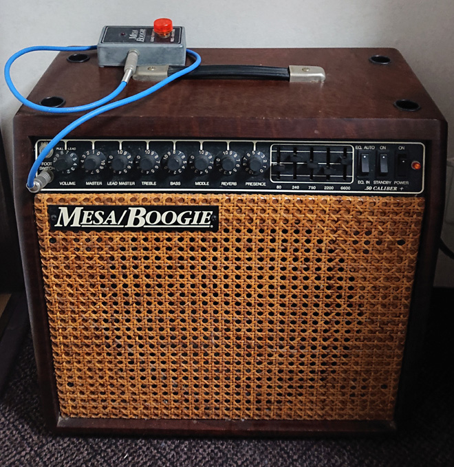前回も写真を送ったのが、MESA .50 Caliber+:寝室での練習用にデザイン上どうしてもラタングリルの付いたハードウッド仕様が欲しく、当時は、新品は既に手に入らなかったので、ノイズが心配だったが唯一中古品で購入。2チャンネル仕様であるが、基本的に1Toneなので、ヴァリエーションは少ないが、グライコ付きでないと、実用性がないと評価されるので、そこはカバーしている。それでも、80年頃のYAMAHA SGや、ディマジオPAFの付いたギターでドライブさせると、寝室内でもSANTANAやG・ムーアのようなフィードバックが起こるので、公団住宅では十分な存在。ノイズは多めだが、それも込みでサウンドの個性と考えている。