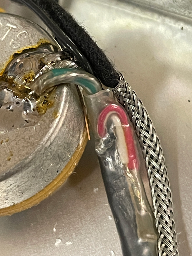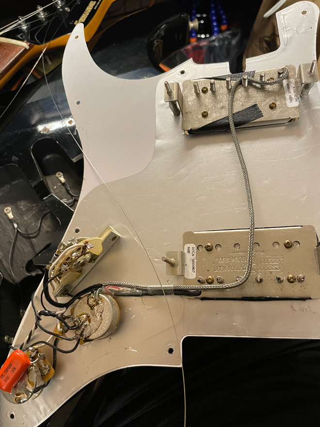 帰宅後、キャビティの中を拝見してまた仰天。パーツ選定が妥協ないチョイスだったし、配線の取り回しも非常に綺麗でした。さらに余った配線を更に熱収縮チューブで覆うなど細かい気配りも感じられました。ギター改造を趣味としている私としてはこのギターの出来に敬服するほかありませんでした。