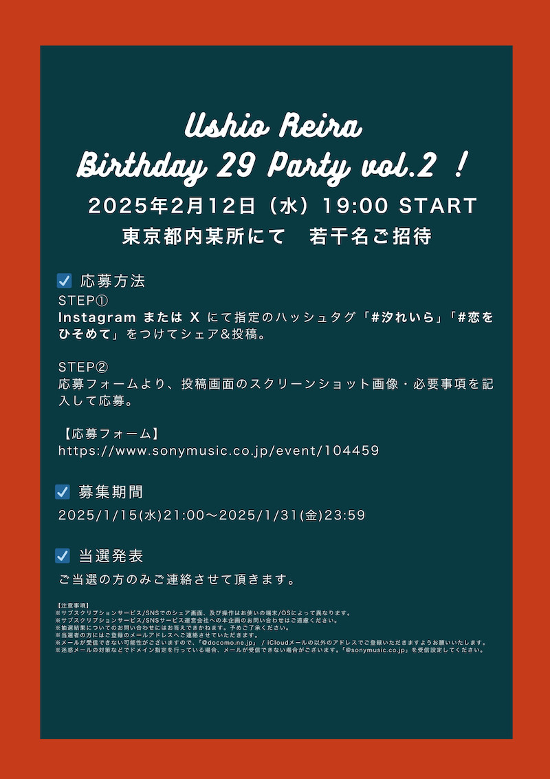 対象期間に、新曲「恋をひそめて」をInstagram/Xでシェア&応募してくださった方から抽選で若干名様を、2月12日に都内某所にて開催される<Ushio Reira Birthday 29 Party Vol.2>にご招待。