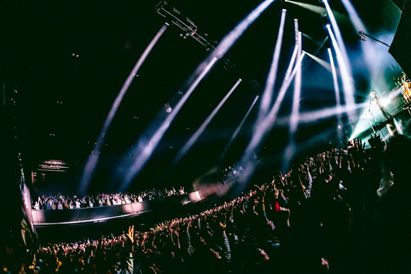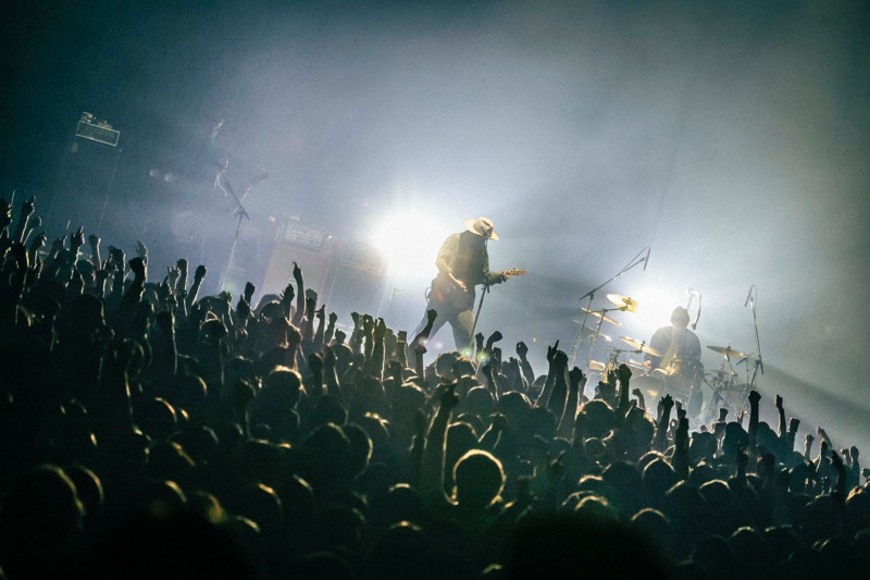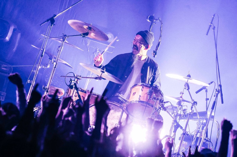 エンタテインメントとしての音楽の感動が、揺るぎない思想へ昇華される、「世界が終わる夜」はそんな特別な曲だ。壮大なロックバラードの轟音の中で、“また此処で笑い合おう”と大木が力の限り叫ぶ。一悟のシンバルの連打が感情をぐらぐら揺さぶる。そして間髪入れずに始まった「輝けるもの」。猛烈なスピード、強烈なストロボライト、佐藤が拳を振り上げてステージ前に飛び出す。映画版『ゴールデンカムイ』主題歌として大ヒットし、ACIDMANを新たなステージに押し上げた大事な1曲。フロアは沸騰、狂喜乱舞の盛り上がりが壮観だ。