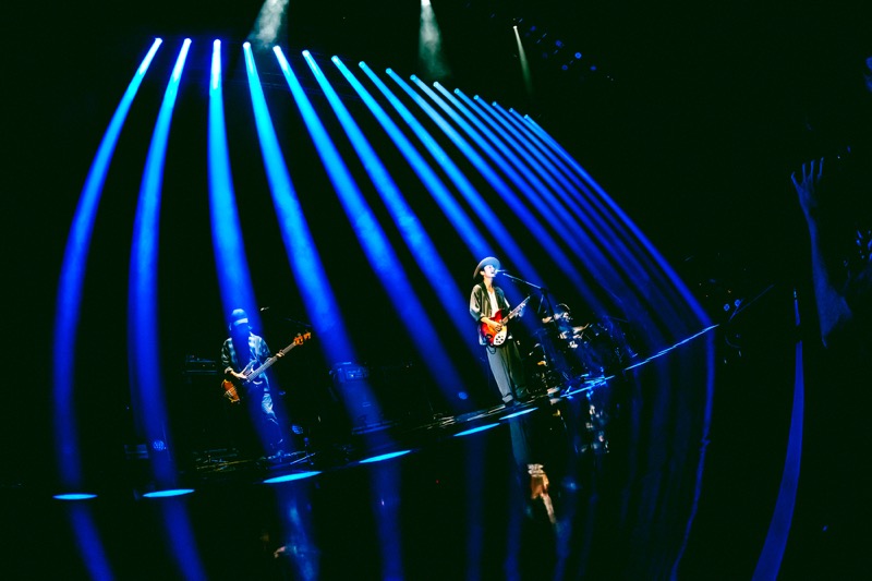 チケットが瞬時にソールドアウトした満員のオーディエンスに向け、まずは「sonet」のミュージックビデオが大画面に映し出される。映画&ドラマ版第1話・9話の監督である、久保茂昭氏が監督を務めたこのミュージックビデオは、森と水辺の雄大な自然をバックに、華麗なコンテンポラリーダンスとバンドの演奏が溶け合う素晴らしい映像美。そしてインストSE「最後の国」、オーディエンスのクラップ、直前のMVと同じ衣装を纏ったメンバー登場からライブ本編へ。いつもと違う流れが新鮮だ。