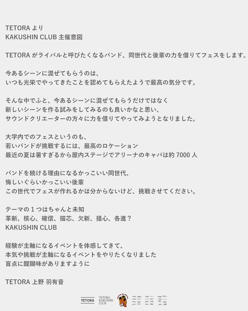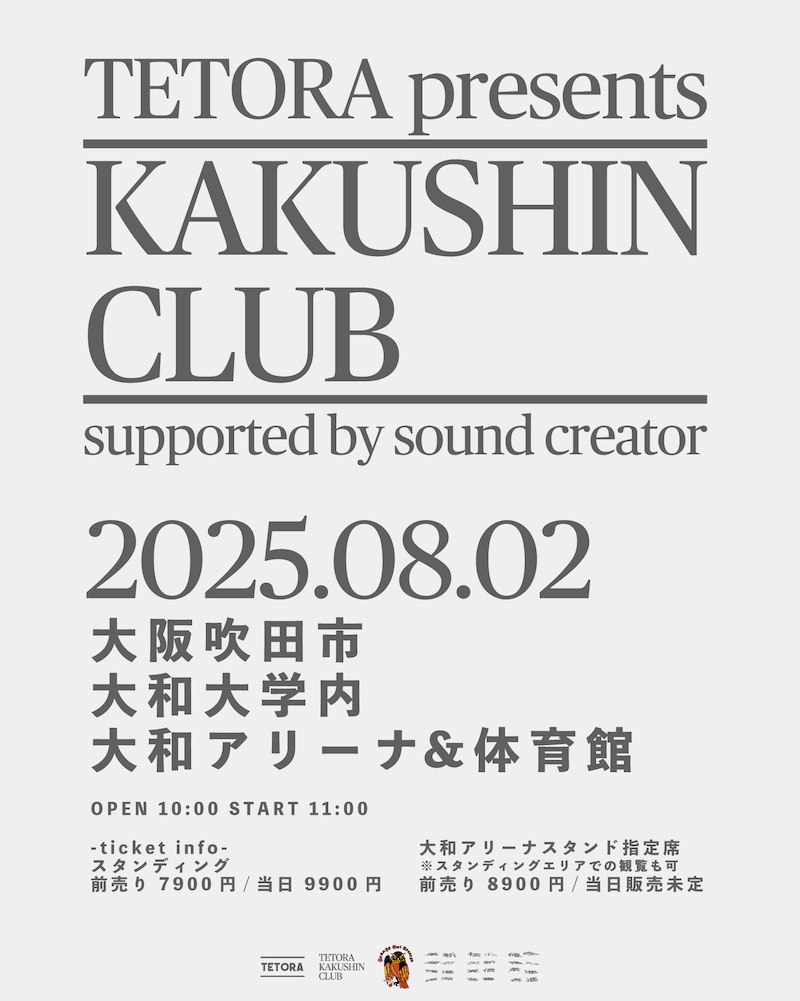 TETORAが、バンド初となる主催フェス<KAKUSHIN CLUB>を8月2日に開催することを発表した。