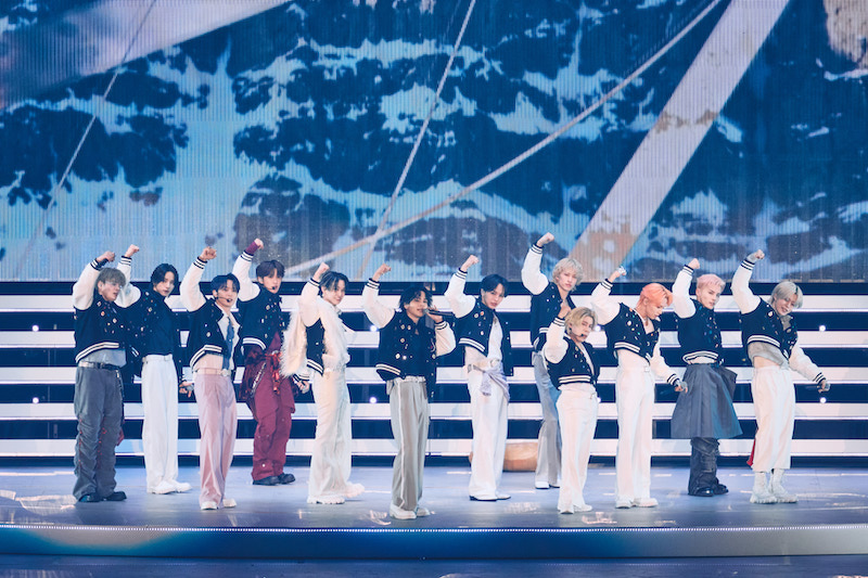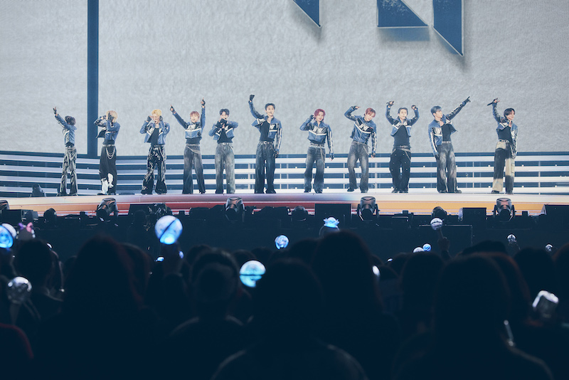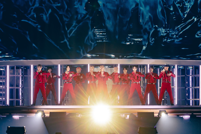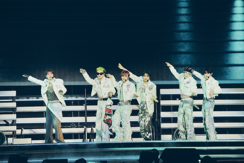 胸にINIと刻まれたブルーのジャケットで揃えたINIは、バックステージ側のベンチからサプライズ登場。エネルギッシュな 「MORE」で幕を開き、観客のボルテージを一気に引き上げていく。西洸人がかけていたサングラスを外し挑発的な表情を見せると、会場から大きなどよめきが。パワフルな楽曲「DROP」では、力強い歌声と気迫溢れるパフォーマンスで観客を圧倒。ラストの「WMDA(Where My Drums At)」では炎が噴き上がる中、ドーム全体に響き渡る歌声と今回新たに披露したダンスブレイクで魅了した。
