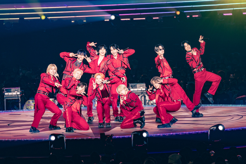 そして凛々しい風格を纏う“Ruby Flame”は、INI「LOUD」と「BOMBARDA」を披露。「BOMBARDA」の終盤で は池﨑理人(INI)の「全員出てこいや!」という叫びに応じて出演者全員がステージ集合し、重量感のある力強い ダンスを繰り広げていった。