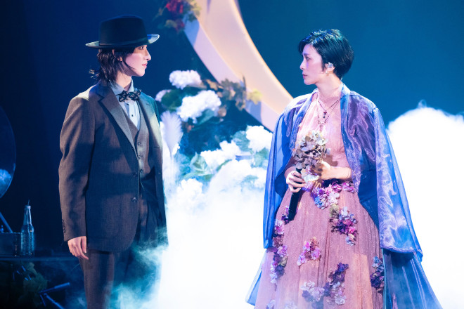 歌い終えた柴咲が両腕を投げ出して呆然と立ち尽くし、和傘を見つけた彼女が傘をさすと、場内に落雷が鳴り響いた。その直後、置かれた傘から一瞬にして変身したように薄紫色の衣装を身につけたパフォーマーが登場。しなやかに踊る彼女に加えて、ハンドパン奏者 REO MATSUMOTOがマイクを持ってボイスパーカッションを展開すると、観客の熱量が一気に上昇。オールスタンディングでクラップを打ち鳴らす中、黒のショートパンツに着替えた柴咲が満を持して登場。「無形スピリット -Mugen Loop Remix-」では会場が一体となってタオルを回して盛り上がると、続く「n0w」ではさらにクラップのボリュームが上がった。そして全編英語歌詞の「Intoxicated」では柴咲が拳を上げてパワーを送り、「よくある話〜喪服の女編〜」ではスインギングなビートに合わせ、シルクハット&スーツ姿に戻ったパフォーマーとミュージカルのようなシーンを演出。ボカロP の⌘ハイノミによる新曲「想待灯」では、<愛してるが欲しい/手繰り寄せる精一杯>というフレーズを声高に歌い上げ、会場全体の感情が高まっていくようだった。そして、ベースが効いた「ラブサーチライト」ではタオルを回して熱狂する観客に向けて<ずっと君を離さないから>と熱い歌声を届け、速いパッセージの楽曲を歌いこなしながら<東京〜!>とシャウト。生のライブであるからこそのダイナミズムと楽しさを感じさせるとともに、ホールをクラブに様変わりさせたかのようなステージングからは、柴咲の表現者としての多彩さが伝わってくるようだった。ここから舞台は⼀変。再び和傘が登場し男女の物語へ。虫の鳴き声が聞こえる中で、花の衣装に身を包んだ柴咲とスーツ姿のパフォーマーは、同じ傘の下で寄り添い歩みを進めていたが、不意に立ち止まり、やがて離れることに。その後、映画『世界の中⼼で、愛をさけぶ』の主題歌「瞳をとじて」をアコースティックギターの音色を基調として情感たっぷりに歌い上げると、続いて名作映画『容疑者 X の献身』の主題歌「最愛」を披露。<⼼の雨に傘をくれたのは あなたひとりだった>と、偶然か否かまたしても“雨”や“傘”にまつわるフレーズを含む1曲が、“命の循環”という本ツアーならではのニュアンスで⼼に浸透してくるようだった。