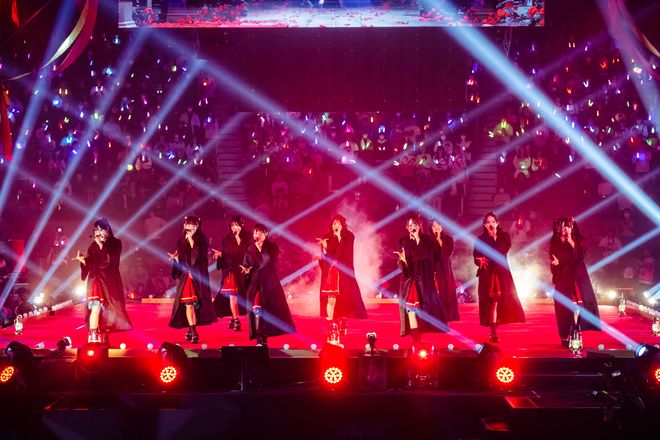 MCを挟んでライブの世界観はガラッと変わり、ダンストラックが流れると、ヴァンパイアのコンセプトで黒のフードがついたガウンで顔を覆ったメンバーが客席から登場。彼女たちが踊る姿にスポットライトが当たる度にどよめきが起こる。