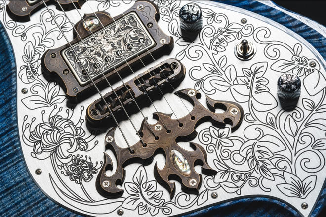 これはすごい、アートや。トライバルと名付けられたエスカッションや、-Difine- & Tribal Plateというブリッジとか、とんでもない造形を持ったパーツ類はESP EXHIBITION LIMITED 2022で発表されたモデルから派生したものですね。メタルトップも凄いな。写真も美麗で、特別すぎる逸品に釘付け状態。でもふと思いました。住宅や自動車のフルオーダーなんて一生にあるかないかだけど、ギターなら求める究極を手にすることができる。これって凄く夢のあるステキな話ですよね。ま、腰が抜けるような価格だとは思うけど。(BARKS 烏丸哲也)